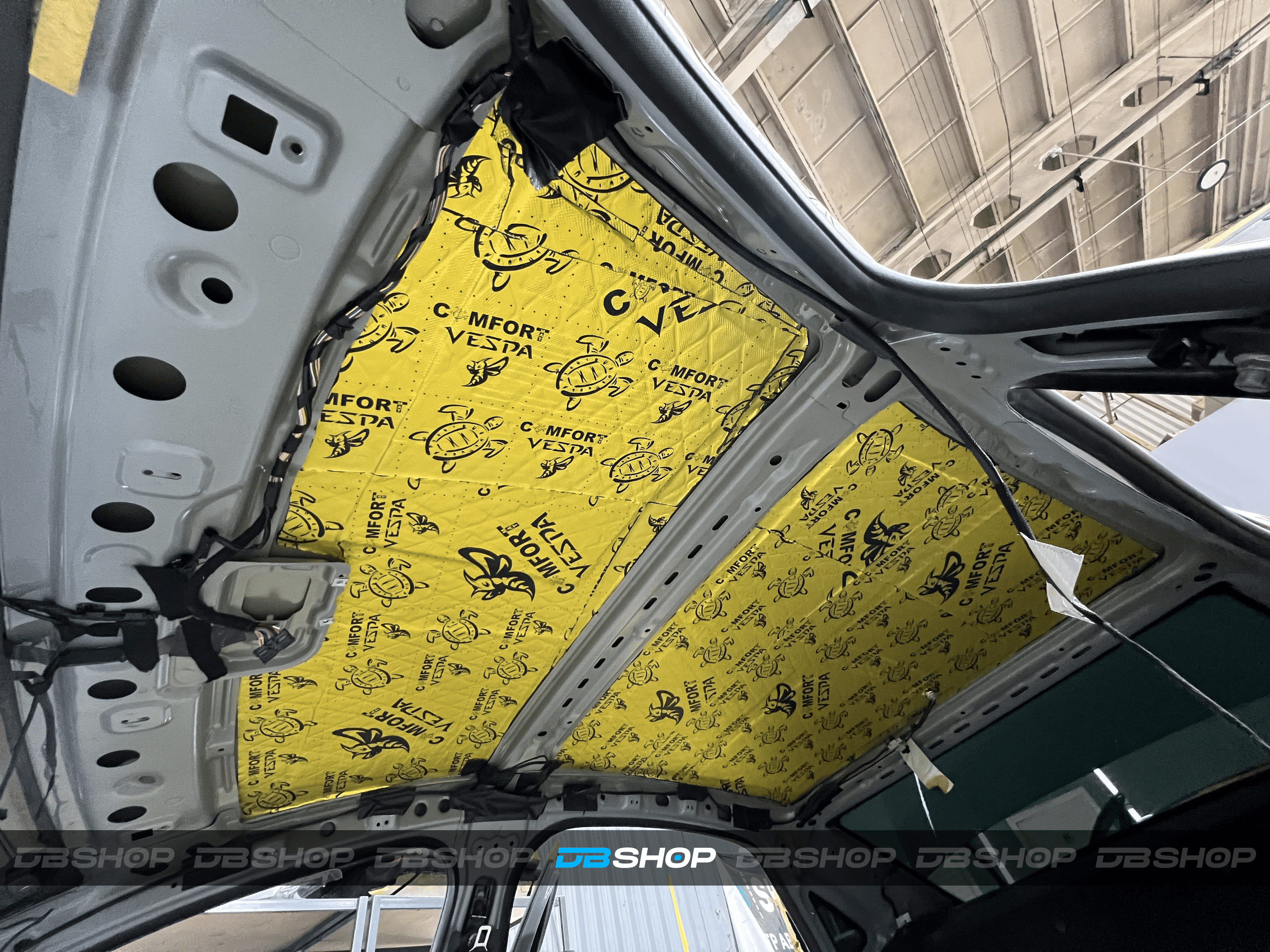 Первым слоем на крышу нанесли виброизоляцию Comfort Mat Vespa. Материал отличается улучшенной адгезией к металлическим поверхностям. Благодаря матовому покрытию фольги обеспечивается хорошее сцепление с шумоизоляционным материалом. Устойчив к воздействию влаги, обладает антикоррозионными свойствами.